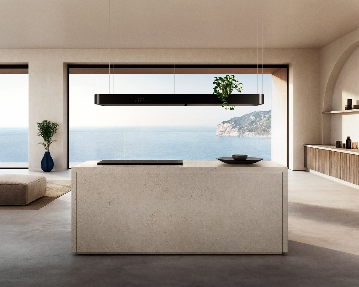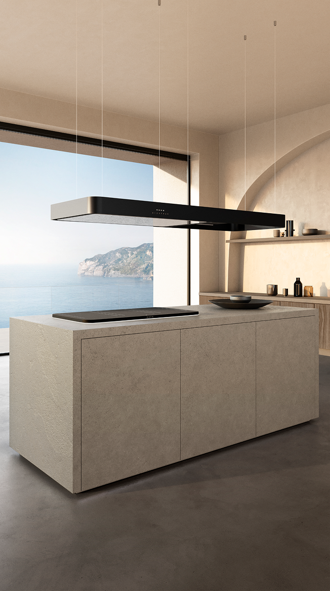 В коллекции есть варочные панели со встроенной вытяжкой, подвесные вытяжки и световые элементы.